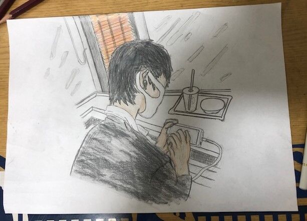 友達がスマホをしているところの写真を見ながら、描いていました。